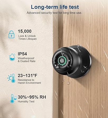 - [Worry-Free Smart Door knob] The smart lock for bedroom doors adds an extra layer of security to your home. Whether you’re looking for a door knob with lock for your apartment or a smart home device to keep your home secure, our fingerprint door lock has what you need. The fingerprint door lock bulit in a rechargeable battery with a 1-year battery life that can be charged by USB Type-C power supply.